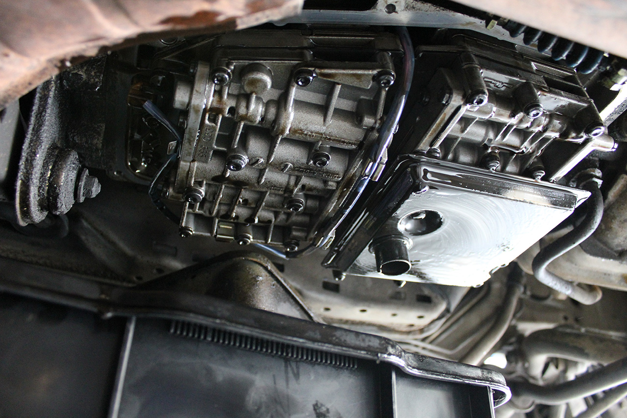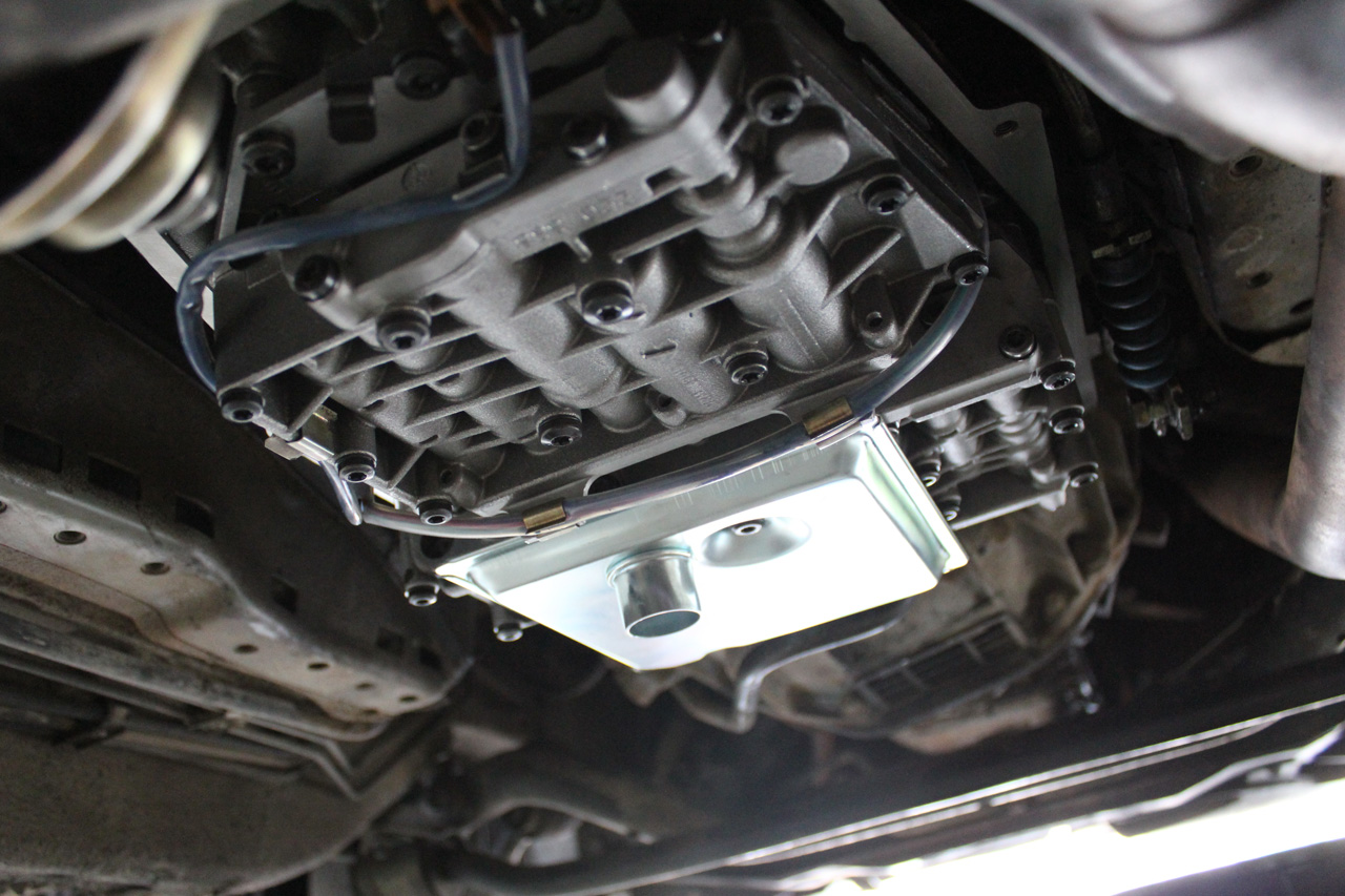 Once the car is in the air that should give you access to the bottom of the transmission.  Place one of the large plastic tubs under the transmission and undo the drain plug with a 5mm allen key.
