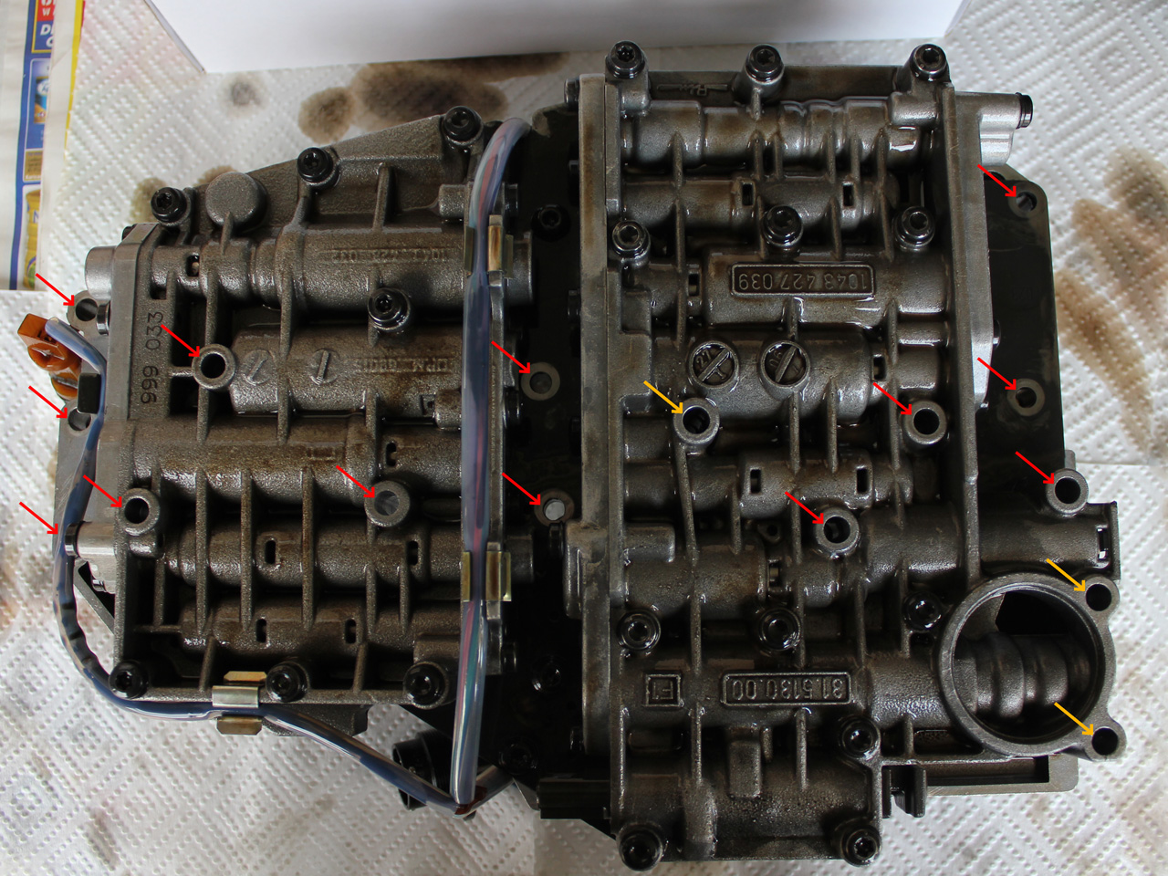 Here is more detail on the location of the bolts.  The orange arrows show the location of the 3 that hold the filter in place, the red show the remaining 13 that mate the valve body to the transmission proper.  When you do remove the valve body be careful not to damage the speed sensor at the rear, or the wiring harness and socket that will come out along with it.