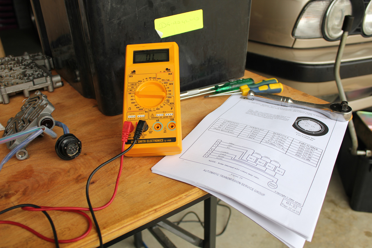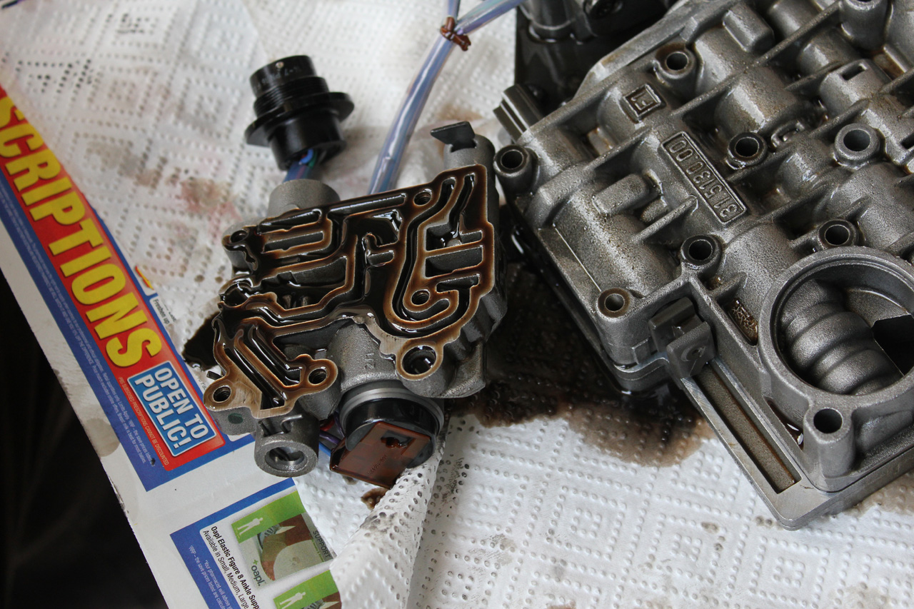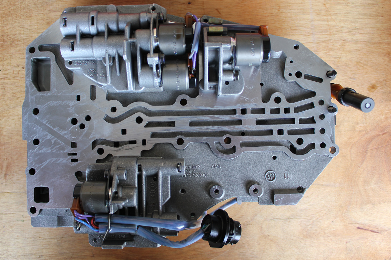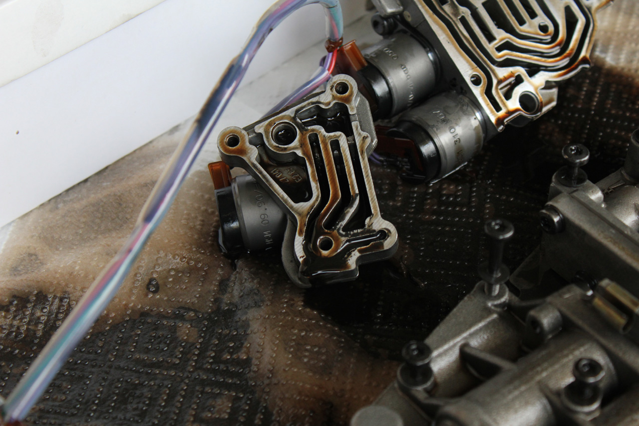 With the bolts removed the MV5 solenoid body falls away.  Pay attention to the wiring harness and associated plugs they tend to be brittle after decades of bathing in hot ATF.  Carefully unclip the wiring as you go.