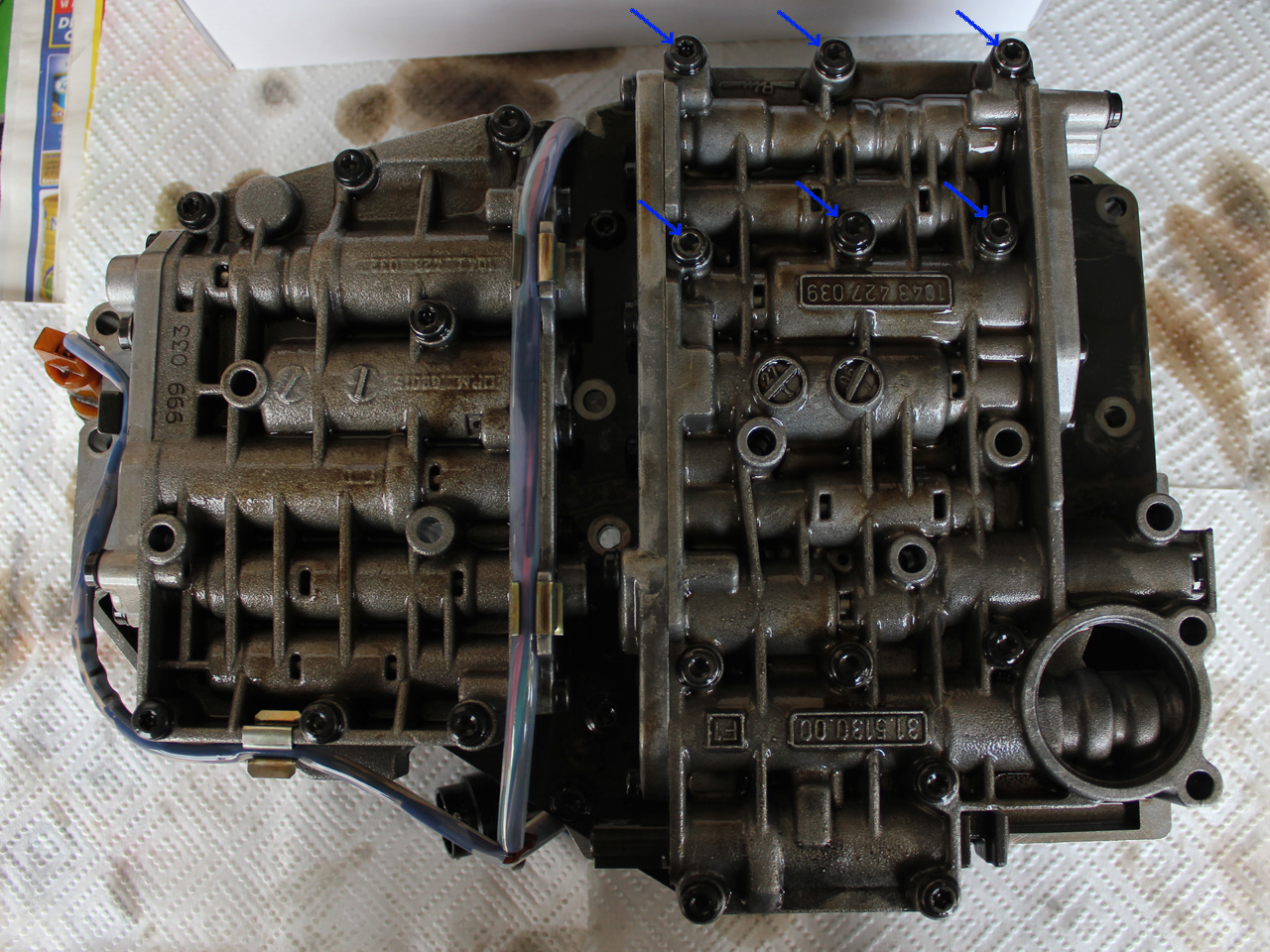 Next in line is the MV1 and MV2 Solenoid body, bolts shown below via blue arrows.
