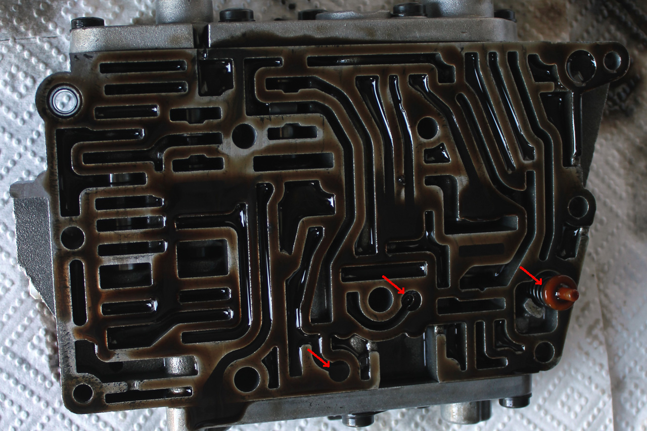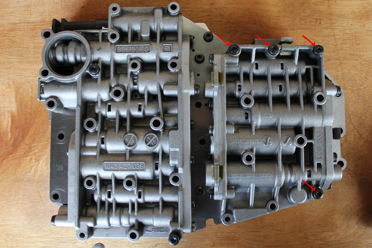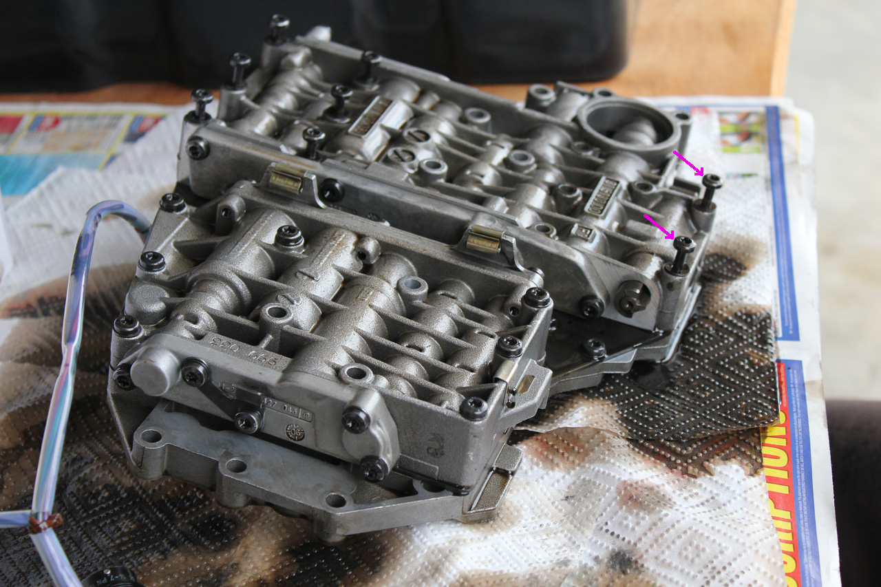 Once you have undone the six bolts, put a couple you have already removed (pink arrows) back in place to stop the lower front section of the valve body from moving around too much.