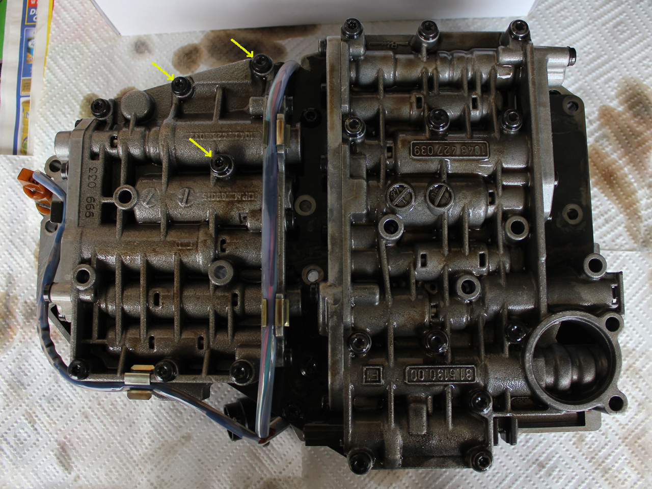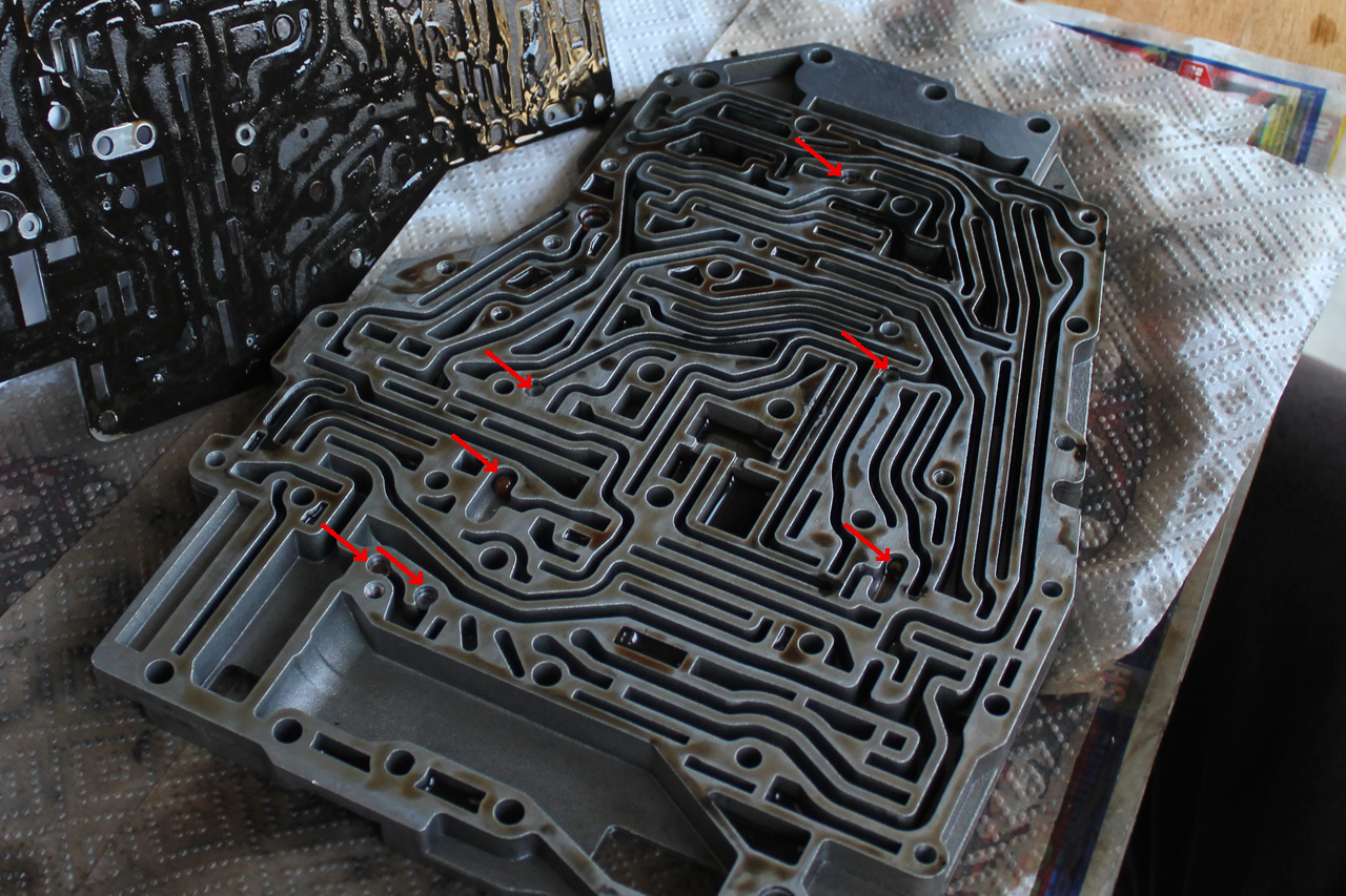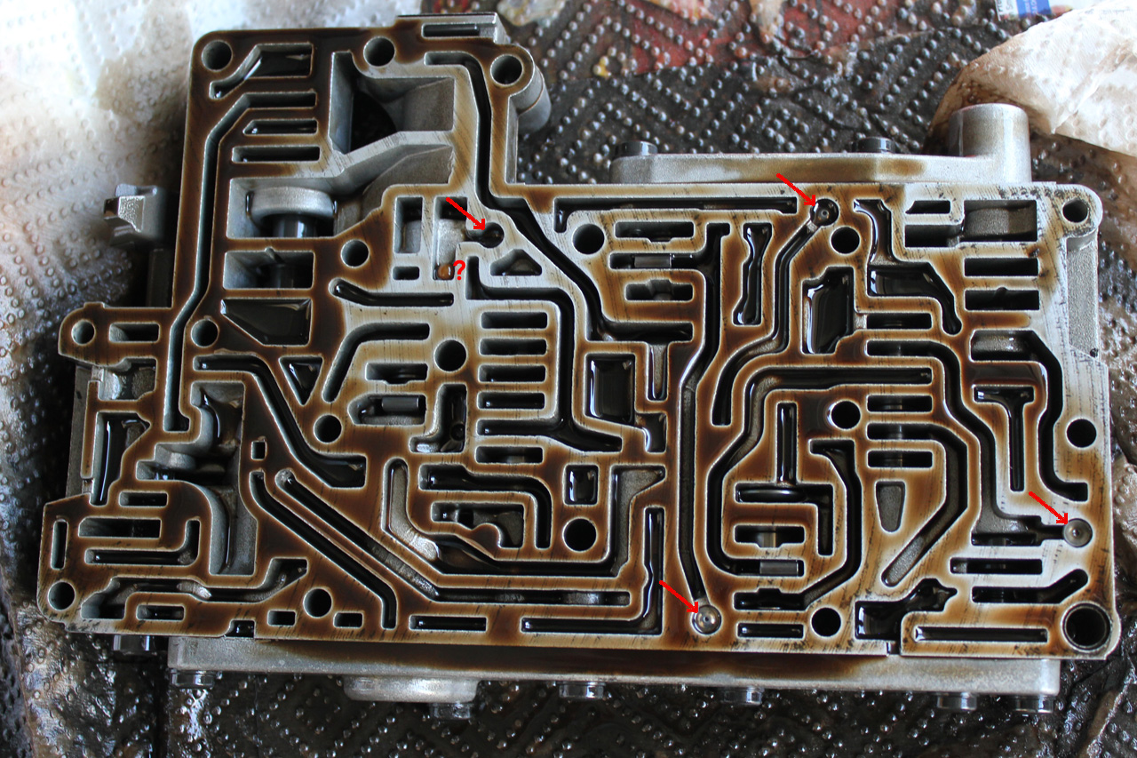Once you have undone the six bolts, put a couple you have already removed (pink arrows) back in place to stop the lower front section of the valve body from moving around too much.