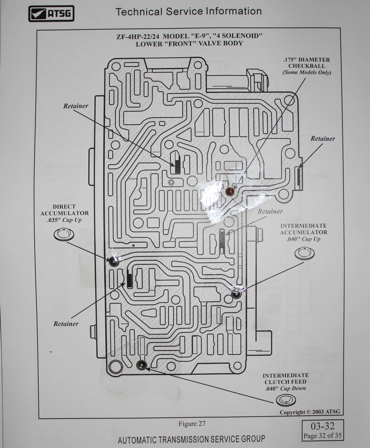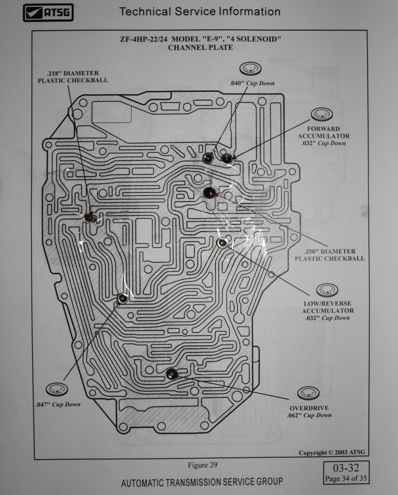 Prepare the channel plate with small dobs of vaseline.   Cut the components out of the sticky tape on the relevant ATSG page using the razor blade one at a time.   Replace the accumulator cups, pushing them into place through the vaseline with a pencil.  Check balls are easy enough to handle with your fingers.  Remember to double check each bit as you do it.   Make sure the cups are placed in the right direction, either up or down.