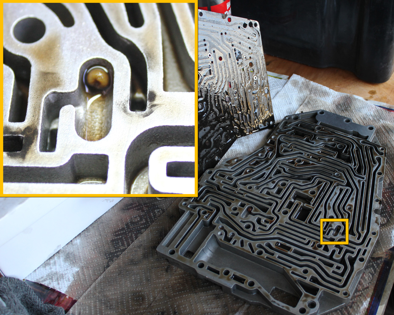 One of the check balls in this particular channel plate is showing signs of severe wear.  Damage to this check ball can cause failure to engage reverse gear.