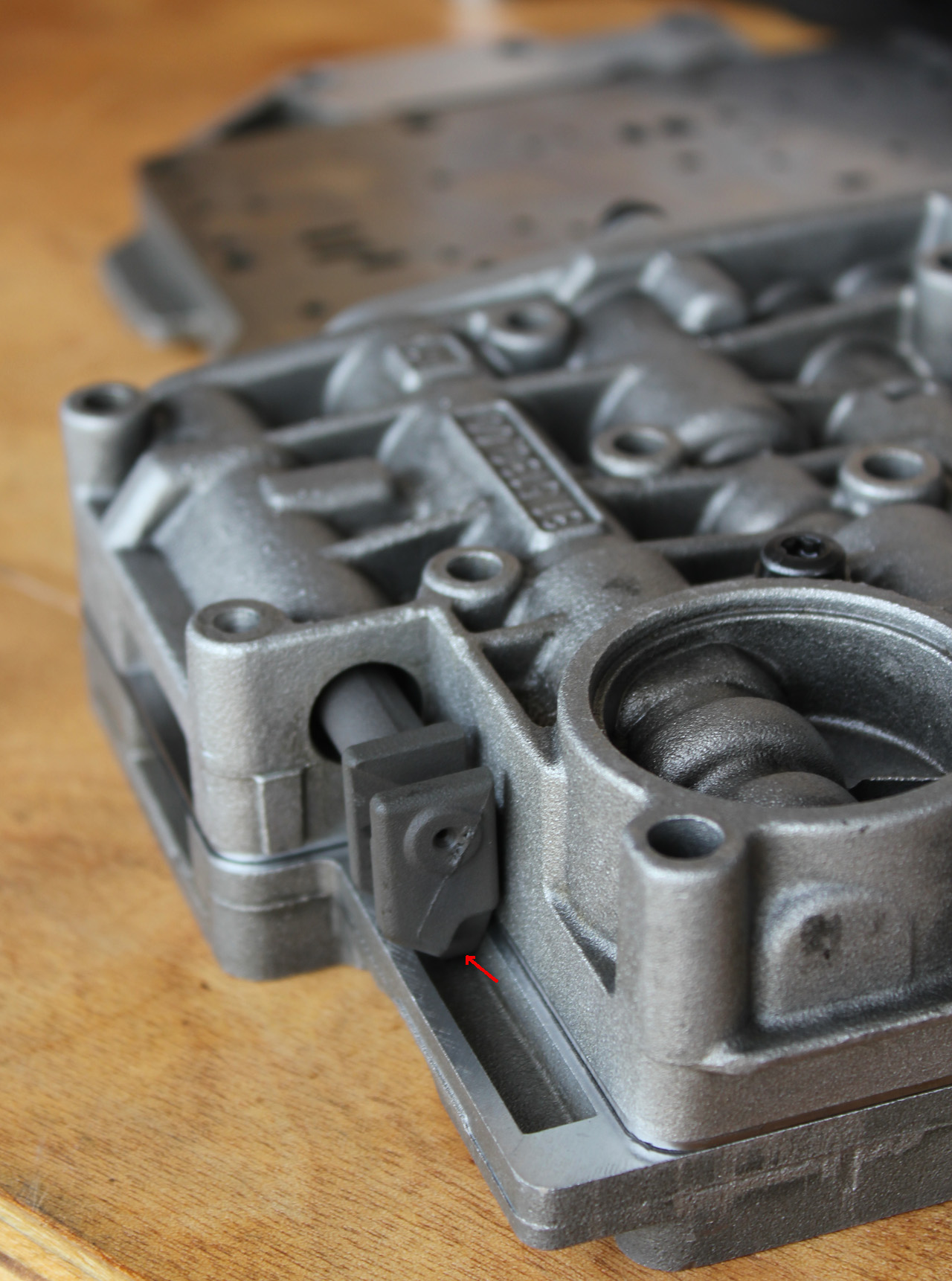 The top side of the completed valve body.  Note the positioning of the speed sensor
